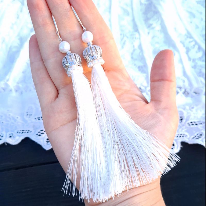 Святкові чи весільні сережки китиці з натуральними білими перлинами високого класу та короною з кристалами циркону.