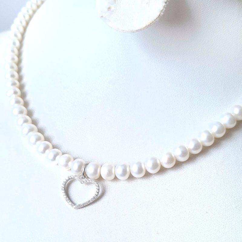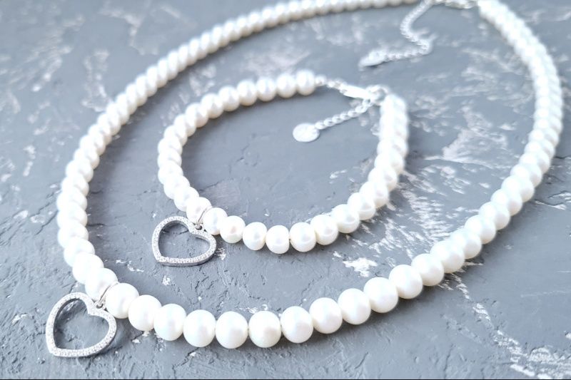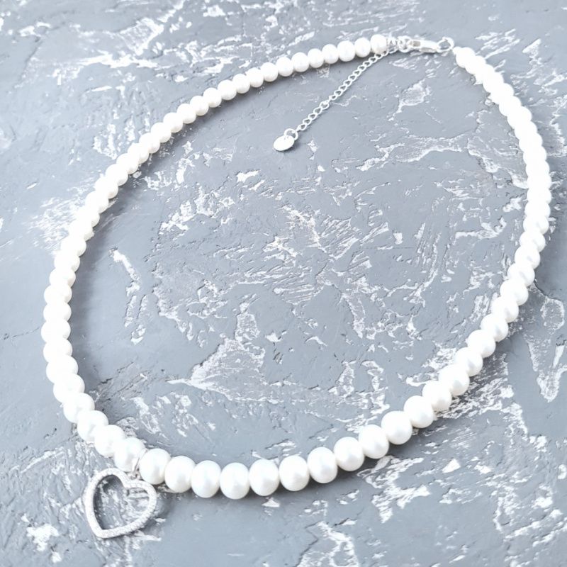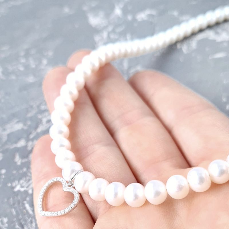 Кольє з натуральних перлів з підвіскою у формі серця з кристалами - найкращий подарунок на 8 березня для дівчини чи дружини. Вся фурнітура у сріблі 925 проби - кулон а також застібка На замовлення - будь-яка, потрібна вам довжина кольє. Вартість вказана за довжину кольє як на фото: 40 см. Розмір перлин: 6-5 мм ( по центру - крупніші, на кінцях - менші). Перлинки гарні , високої якості, світяться. На інших фото є браслет, що не входить у вартість, але також може бути замовлений окремо. На замовлення до кольє також можу зробити сережки з подібними підвісками. На останньому фото є святковий футляр з натурального дерева, який не входить у вартість, але може бути замовлений окремо.