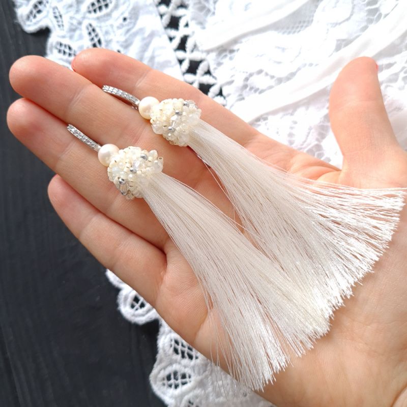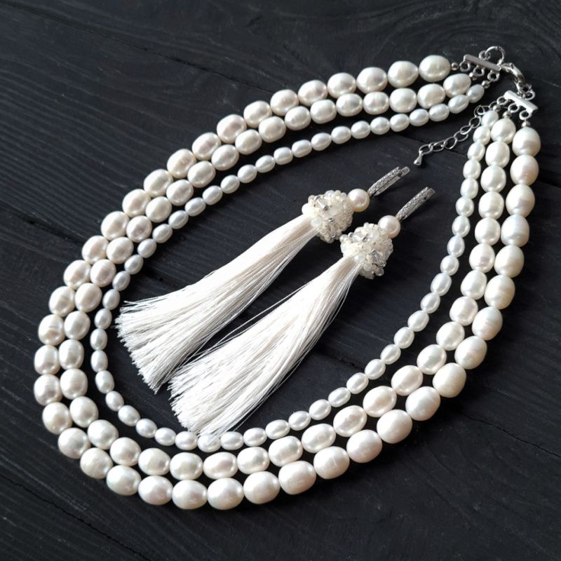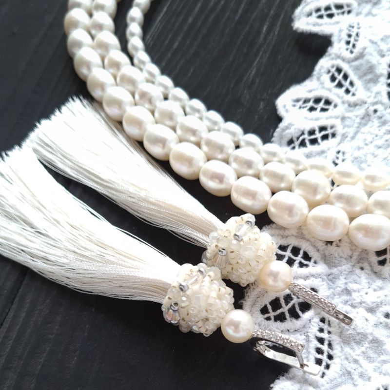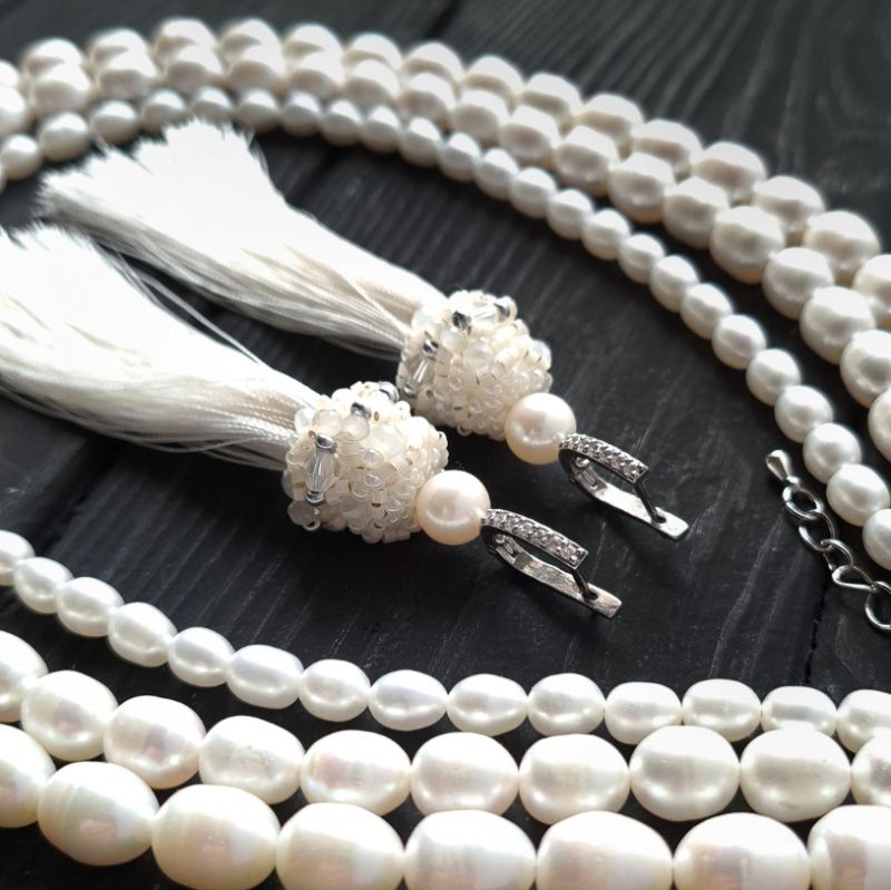 Срібні сережки китиці з натуральними перлинами та кристалами - прекрасний подарунок на перлове весілля чи прикраса для нареченої. Застібки сережок: срібло 925 проби , інкрустовані кристалами циркону. Форма застібки: англійский замок. Загальна довжина сережок: 12 см. На замовлення можлива інша, потрібна вам, довжина. У комплект до сережках можу на замовлення виготовити кольє, браслет або кулон. Кольє на інших фото не входить у вартість, але може бути замовлене окремо.