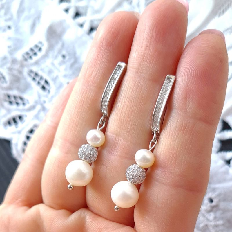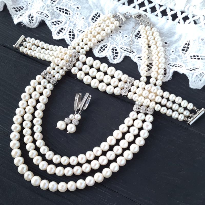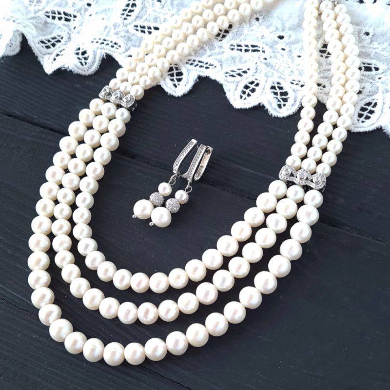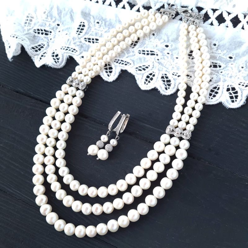 Комплект прикрас: розкішне намисто та сережки з натуральних білих перлів, що можуть стати прекрасним подарунком коханій дружині на новий рік, перлове (жемчужне) весілля, або ж прикрасами для нареченої.