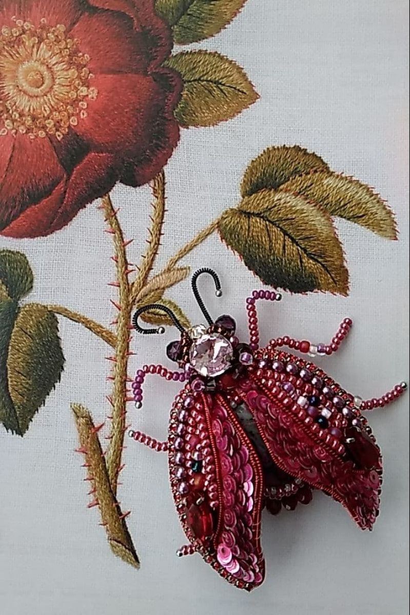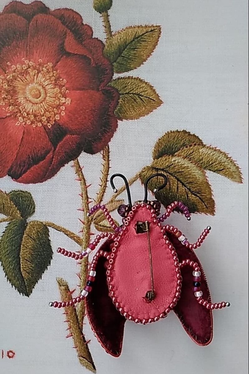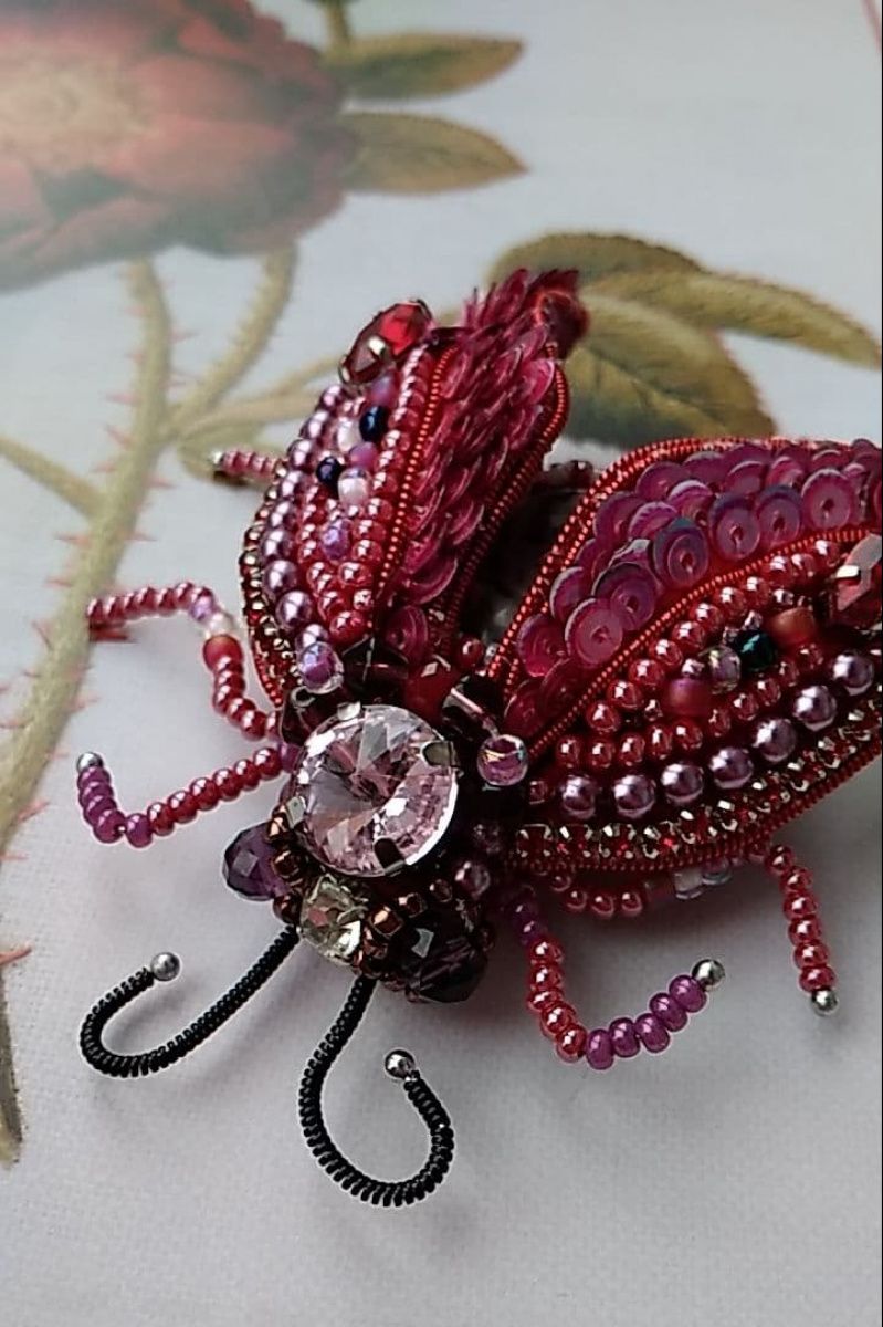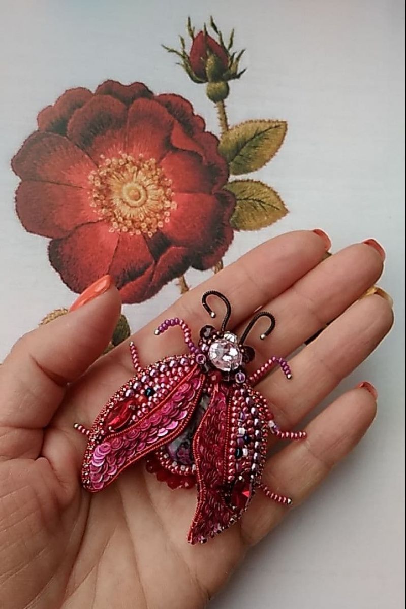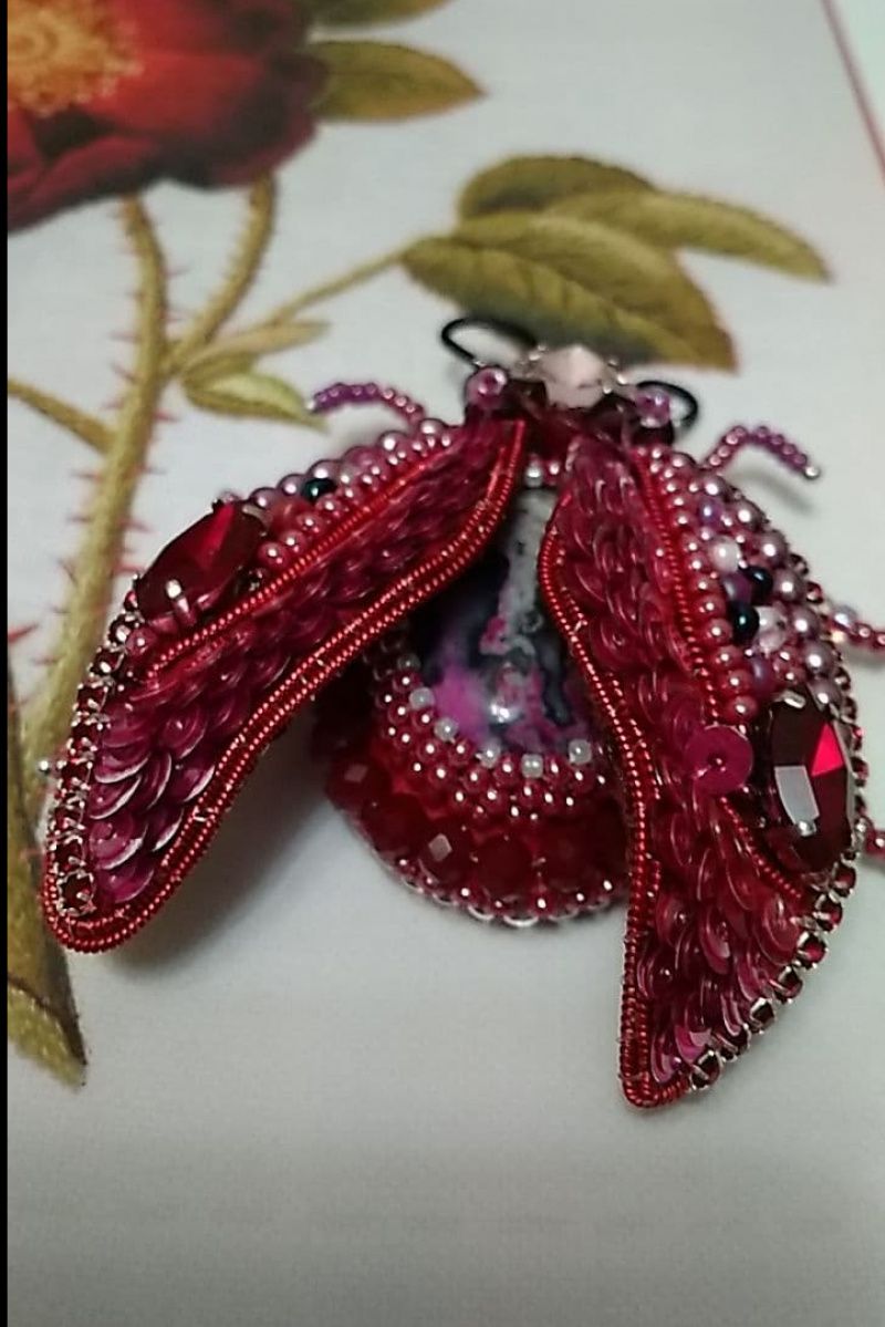 Яскрава брошка Жук ЗД. Довжина туловища близько 5 см,ширина с крилами близько 5 см. По крайнім точкам размір 7х 6 см. Крыла вишиті пайетками, бісером та бусинами. Зворотня сторона брошки з натуральної шкіри.