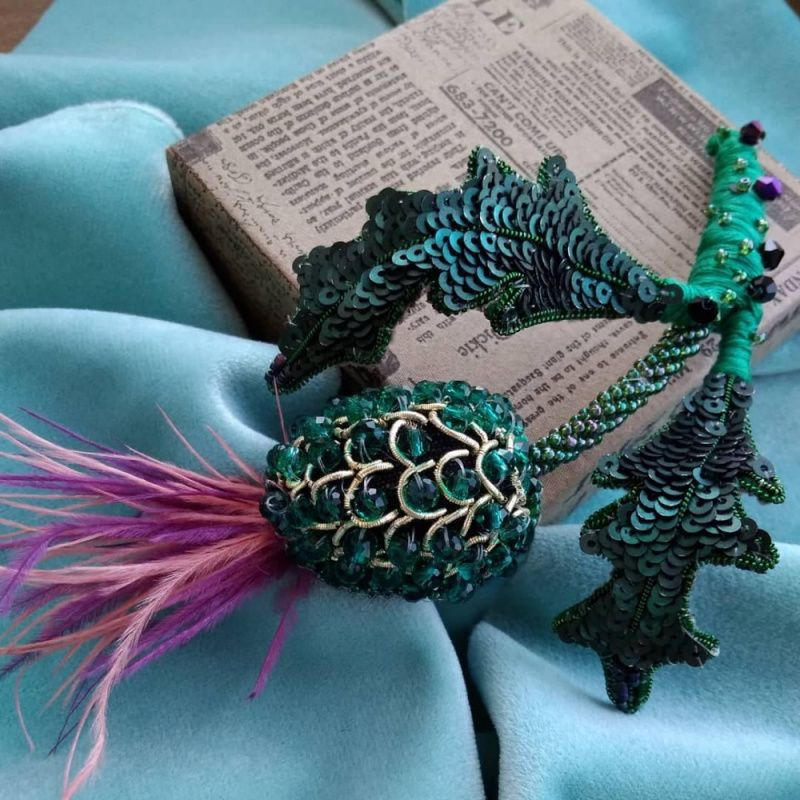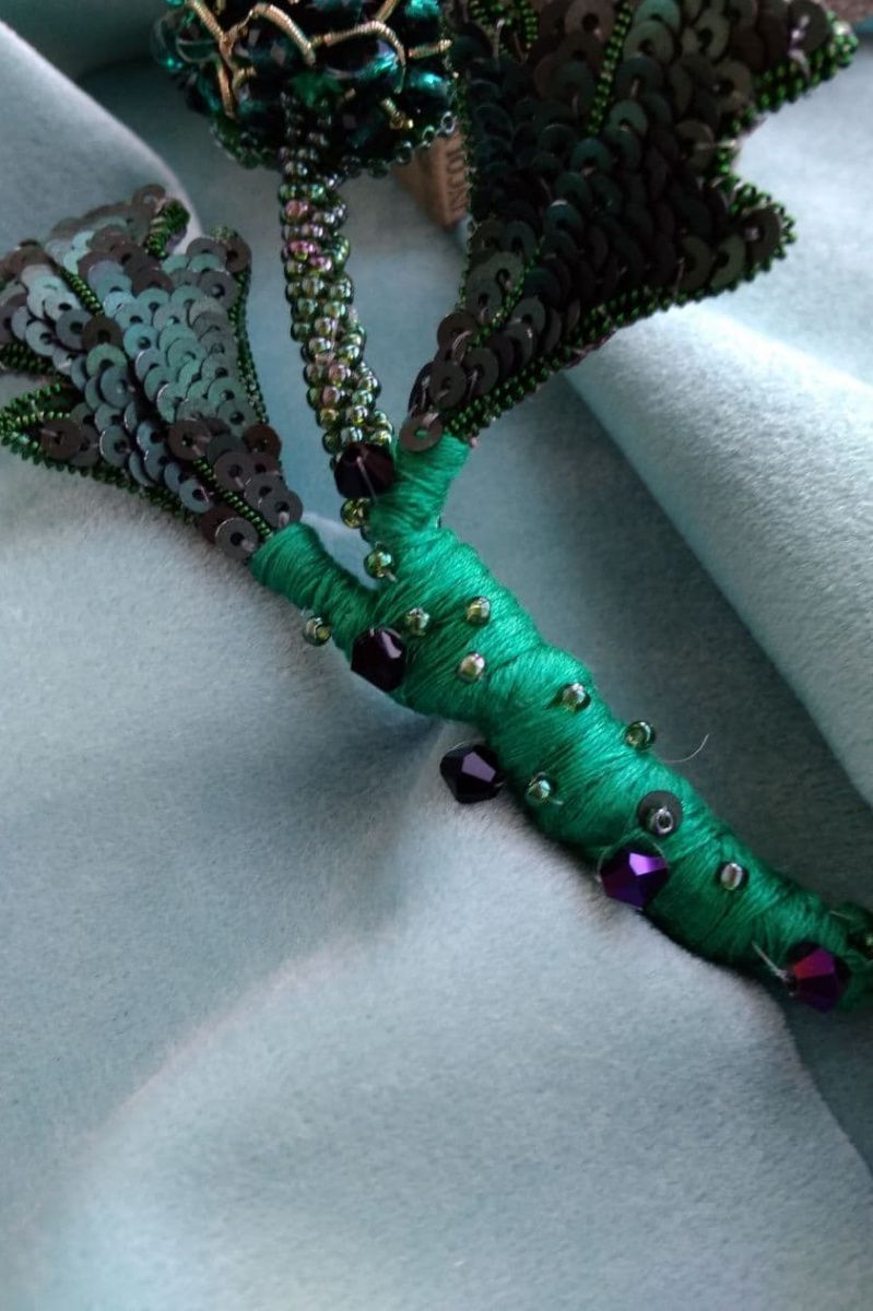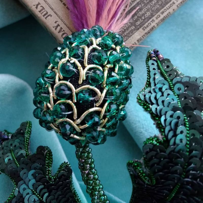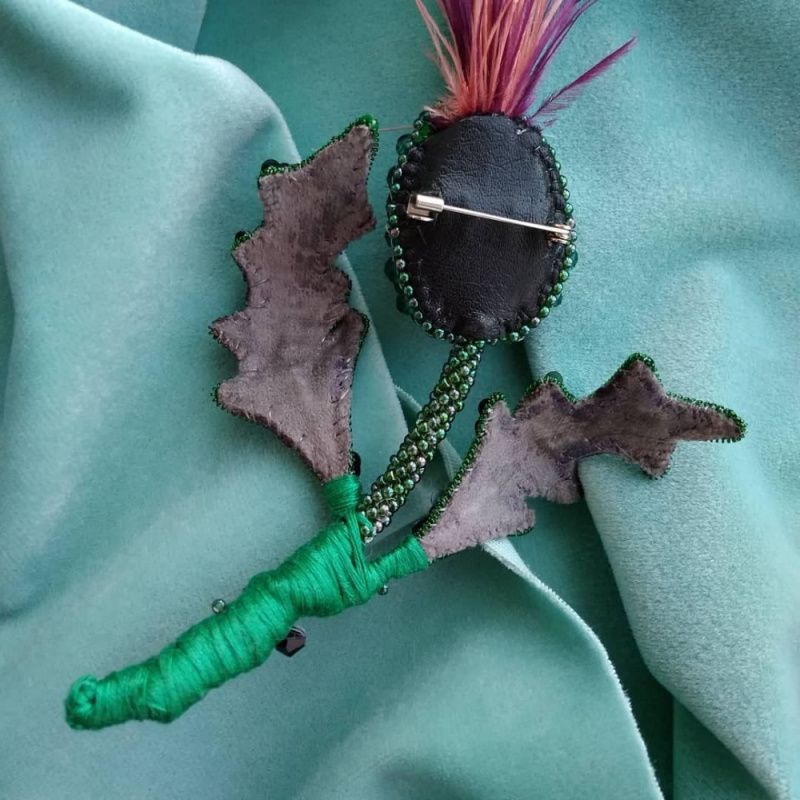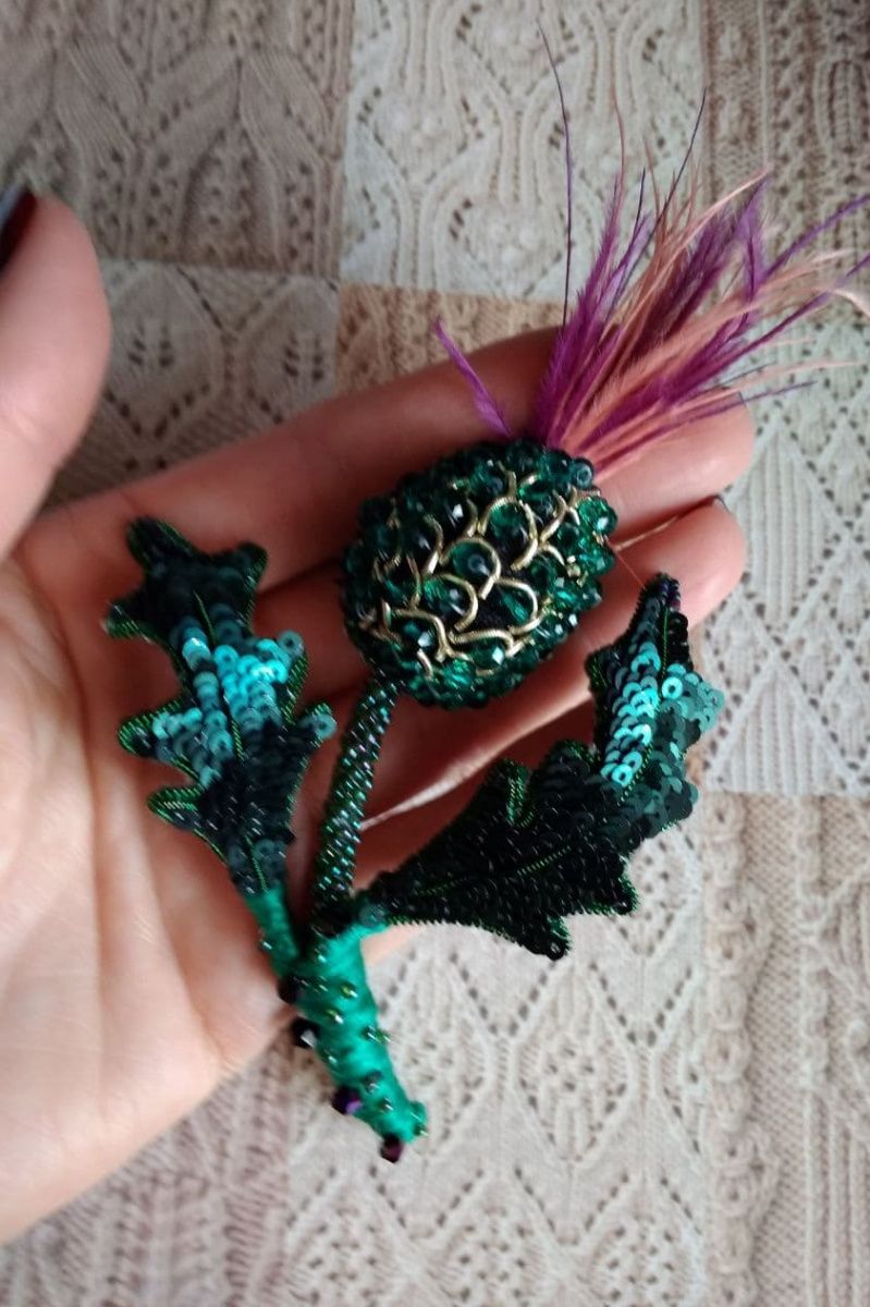 Об'ємна брошка чортополох в змішаній техніці. За прикметами квітка чортополоху відганяє погані наміри інших людей. Листя гнучке, можна міняти його положення, вишите пайетками. Квітка декорована пухнастим страусиним пером та граненими бусинами. Гарна прикраса як для костюму так і для вечірнього вбрання