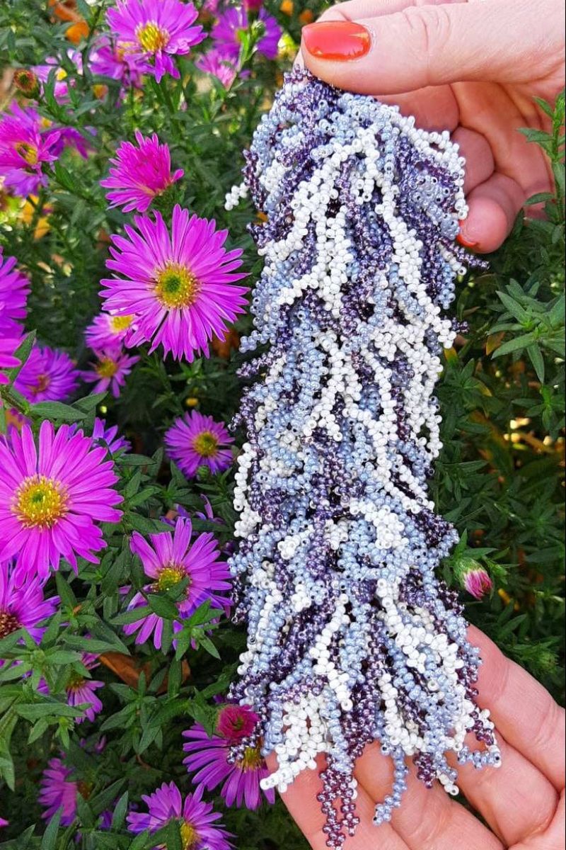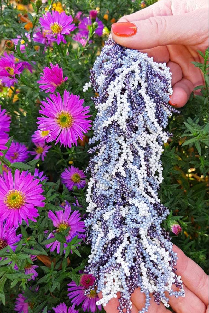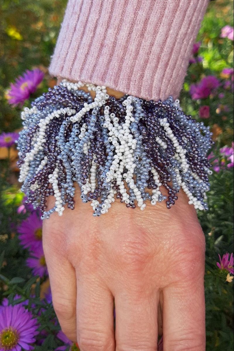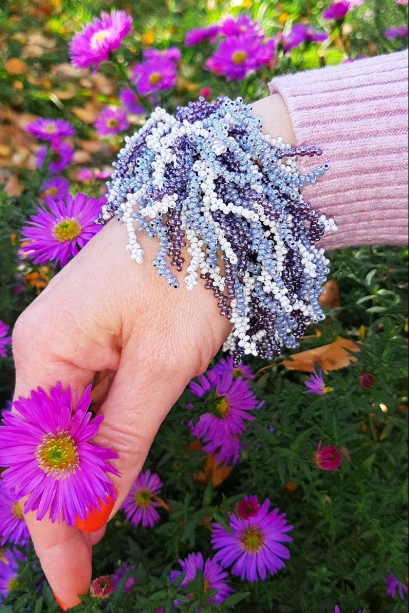 Об'ємний браслет із бісера спокійних кольорів. Довжина браслету 17 см, ширина 4 см, довжина "ворсинок" близько 4 см . Імітує хутро. Гарно низпадає.. Магнітна застібка. Можливе виконання в іншій кольоровій гаммі