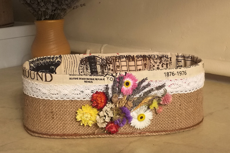 Цей кошик надасть затишку, краси і особливої атмосфери вашій оселі, адже для його виготовлення використані були всі натуральні матеріали, навіть для прикраси взялись справжні сухоцвіти, колоски, маківки і лаванда.